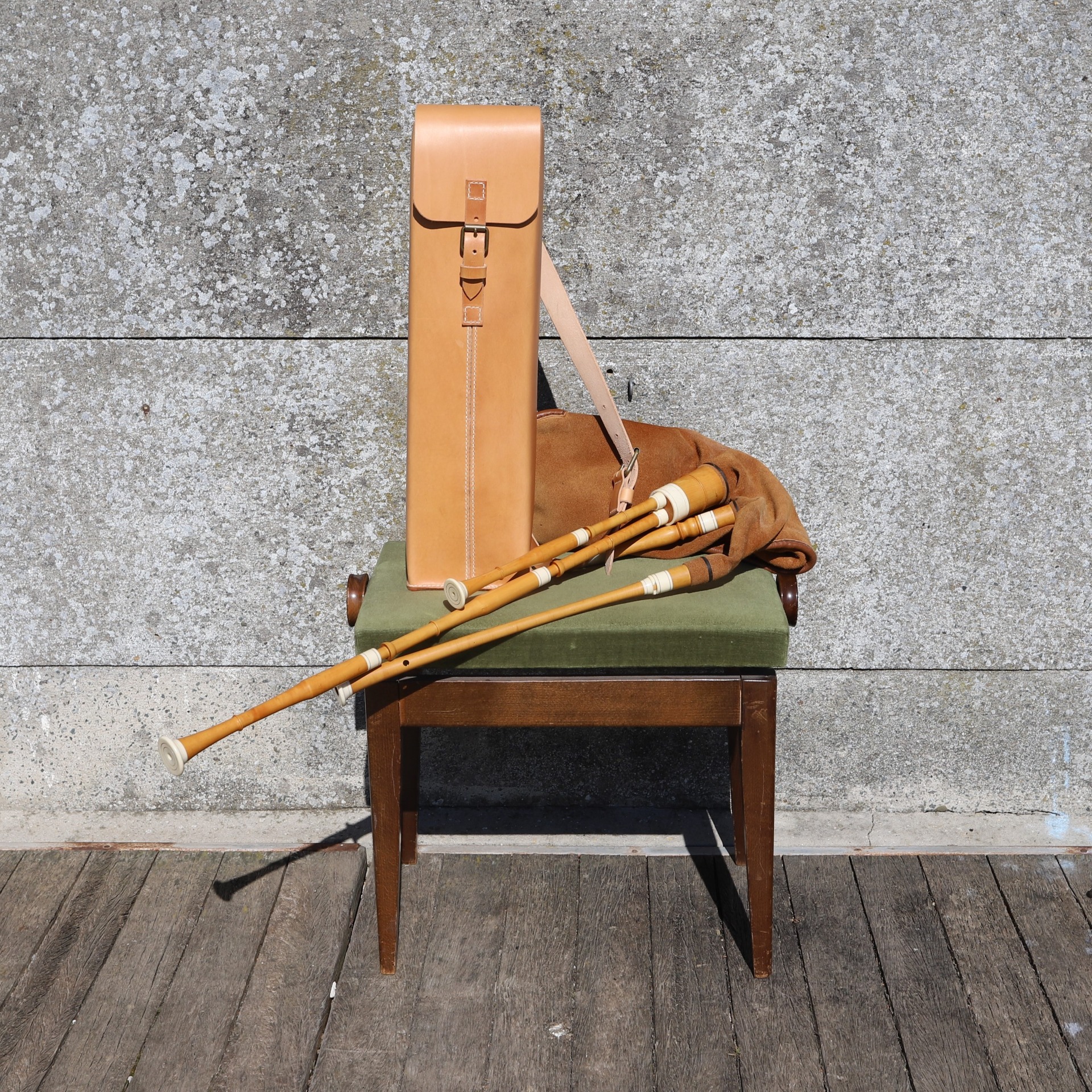 Een rechthoekige doedelzak-tas voor doedelzak in G, A of Bb met binnenmaat - h 58cm x b 15cm x d 10cm-, een bronskleurige rolgesp als sluiting en verstelbare schouderriem.